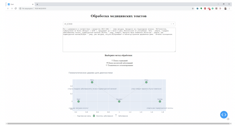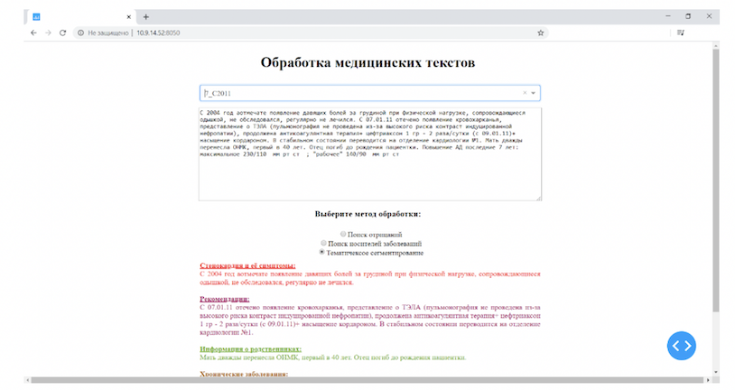 Библиотека представляет собой многофункциональную программную реализацию связанные функциональных модулей работы с медицинскими текстовыми данными: проверку корректности, выделение отрицаний в тексте, выделение тем (topic modelling), выделение сущностей по классам, выделение специализированных структур (например, наследственного анамнеза) и пр. Функционал библиотеки в настоящее время расширяется. Для интерактивной демонстрации возможностей библиотеки реализован сервис, позволяющий продемонстрировать функционал на примере трех избранных функций (рис. 1): выделение отрицаний, тематическая сегментация, поиск информации о родственниках в тексте.
