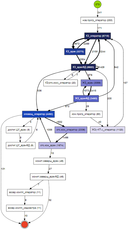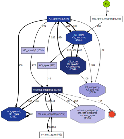 В процессе использования библиотека принимает на вход журнал событий (лог), состоящий из нескольких случаев реализации процесса и записей о совершённых действиях (событиях), зарегистрированных в порядке их выполнения, и выдаёт графовое представление модели процесса (рис. 2), в которой связи между вершинами-событиями представлены в виде рёбер. Вершины в виде одинарного и двойного круга обозначают начало и конец процесса соответственно. Начальная вершина показывает общее количество случаев в журнале; на нетерминальных вершинах и рёбрах графа отображены абсолютные частоты событий и переходов соответственно.