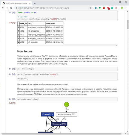 Библиотека реализует базовые алгоритмы интеллектуального анализа процессов (process mining, PM) с дополнительным функциональным расширением в части упрощения и интеллектуализации работы с формируемыми моделями. Она представляет собой набор скриптов на языке Python. В качестве базового функционала в библиотеке реализовано построение карт процессов по журналу событий с визуализацией на базе библиотеки graphviz.