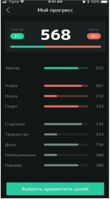 Аватар основан на системе приоритетных целей. Владелец выбирает для себя три основные цели, например, учебу, науку и спорт.