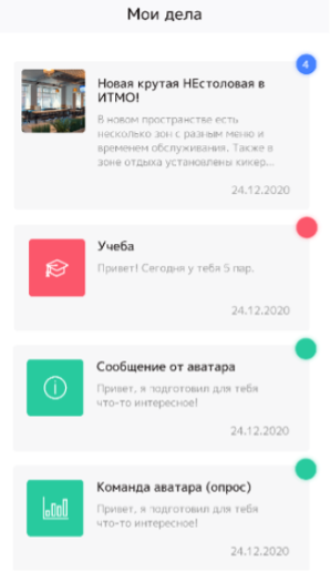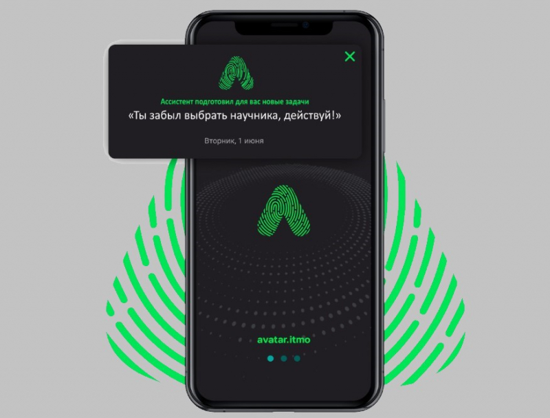 Аватар — это персональный цифровой ассистент, который обучается работать с информацией, чтобы снизить когнитивную нагрузку своего владельца и помочь ему идти к целям. Аватар умеет персонализировать новости и события под текущие интересы, помогает отслеживать прогресс по выбранным направлениям развития и подсказывает, что можно сделать для достижения личных целей в среде университета.
