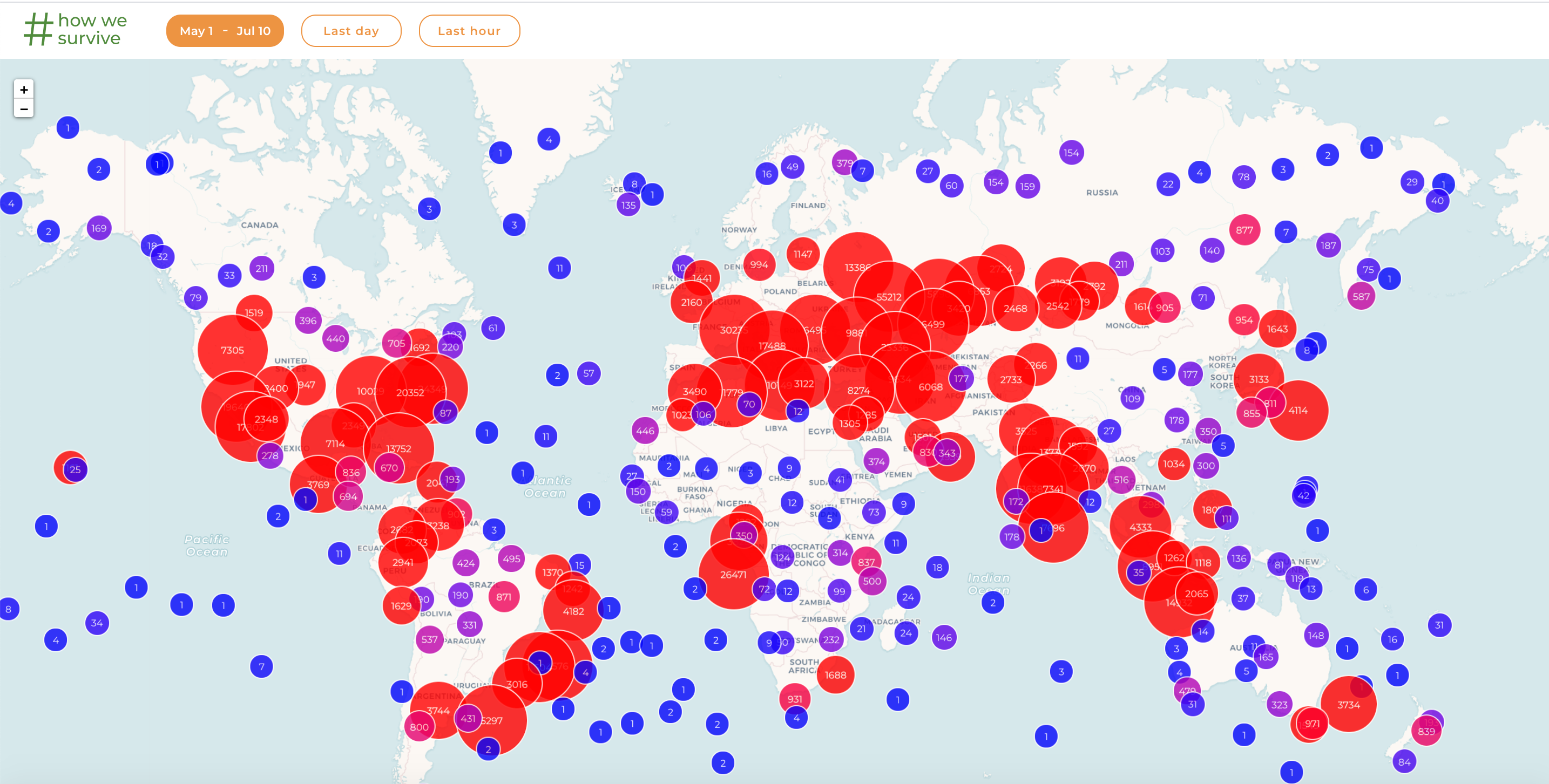 Приложение представляет собой веб-сервис, обеспечивающий доступ к записям пользователей социальной сети Instagram, связанным с пандемией Covid-19. Доступ осуществляется посредством карты, на которой расположены маркеры с агрегированными постами. При изменении масштаба карты маркеры изменяются на более или менее детализированные. При нажатии на маркер пользователь получает набор записей, сделанных в области маркера. Это является ключевым отличием приложения от встроенных в социальные сети инструментов — возможность просмотра записей на карте во времени.